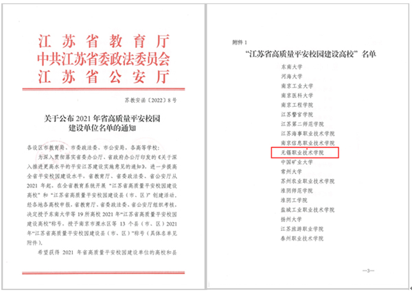 近日,江苏省教育厅、中共江苏省委政法委员会、江苏省公安厅联合印发了《关于公布2021年省高质量平安校园建设单位名单的通知》(苏教安函﹝2022﹞8号),我校荣获首批“江苏省高质量平安校园建设高校”荣誉称号。