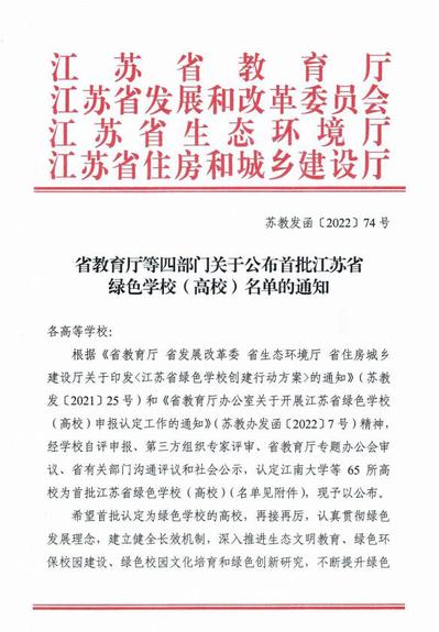 近日,江苏省教育厅、省发展和改革委员会、省生态环境厅、省住房和城乡建设厅等四部门联合发布首批江苏省绿色学校(高校)名单,我校位列其中。